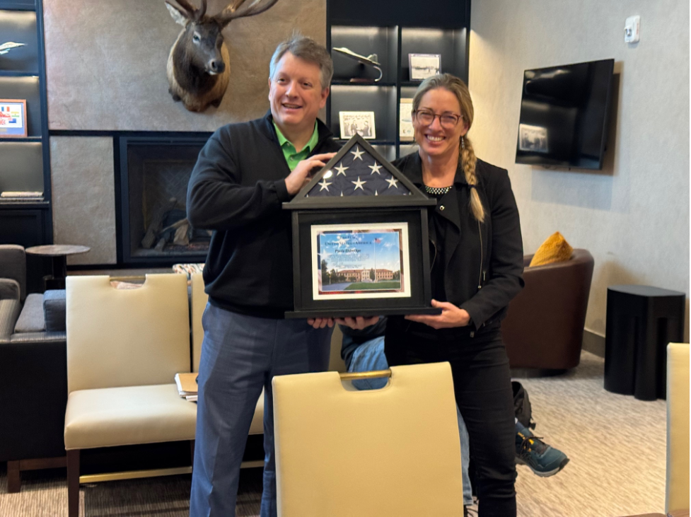 MIDA CFO Paula Eldredge was recognized for her financial expertise and commitment to the Salute to Service program at GRAND HYATT Deer Valley. A flag was flown at Hill Air Force Base on April 15 (appropriately, Tax Day!) in Paula’s honor. She was presented with the flag on Feb. 23 in the dedicated military concierge lounge at GHDV, North Star.